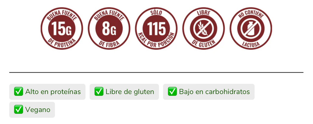 Proteína Aislada de Soya, Incrementador de volumen (SIN 1200), humectante (SIN 422), Proteína Aislada de Arveja, Cobertura Sabor Chocolate (Azúcar, Aceite de Semilla de Palma, Cacao en Polvo, emulsionante (SIN 322(i)), Sal), Inulina, Cacao en Polvo (4,6%), espesante (SIN 1400), Masa de Cacao (2%), Agua, Aceite de Girasol, Sal, Proteína de Arroz y Agar.