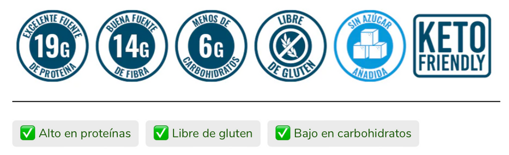 Mezcla de Proteínas (Aislado de Proteína de Leche, Proteína de suero de leche concentrada, Proteína de suero de leche aislada, Lecitina (Soya, Girasol), Isomaltooligosacárido, Cobertura de chocolate blanco (13%) (Manteca de cacao, Leche Entera, Eritritol, ESTEVIA (*), Leche, Inulina, Lecitina de Girasol, Saborizante Natural), Agua, Oligofructosa, Eritritol, Avellana (5%), Saborizantes Artificiales, Nibs de cacao (0.4%), Ácido.
